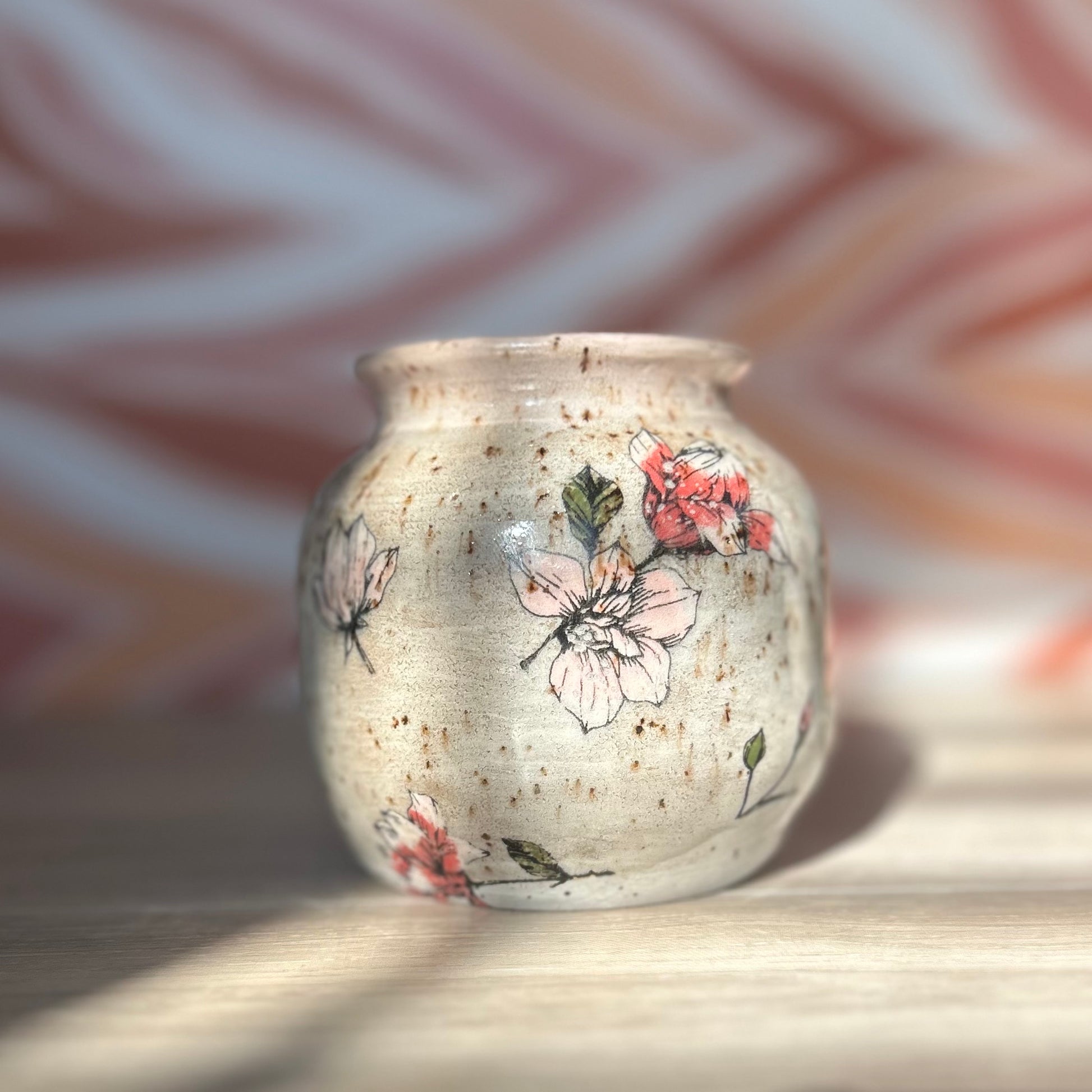 Add a splash of color to your space with this mini vase. Fun and playful, this vase features illustrations of magnolia flowers in shades of pink on a white background and a light pink rim. Perfect for displaying small flowers or adding a pop of color to any room.